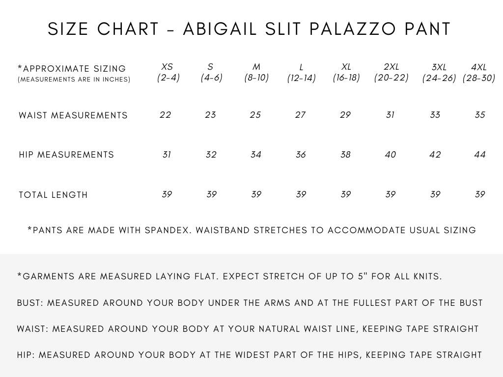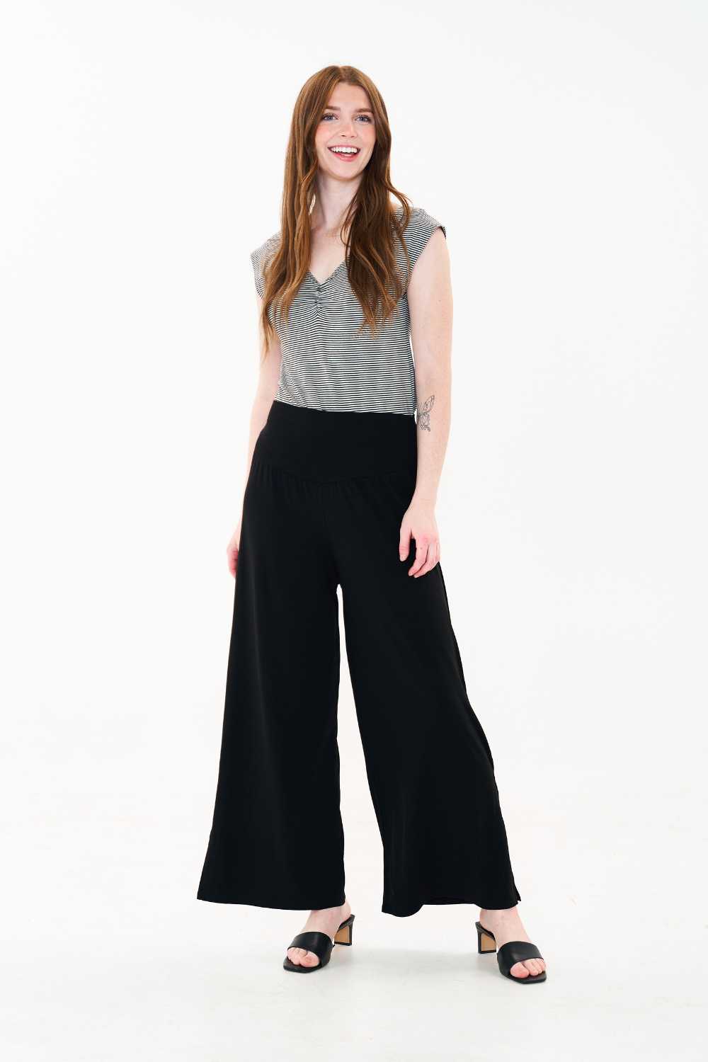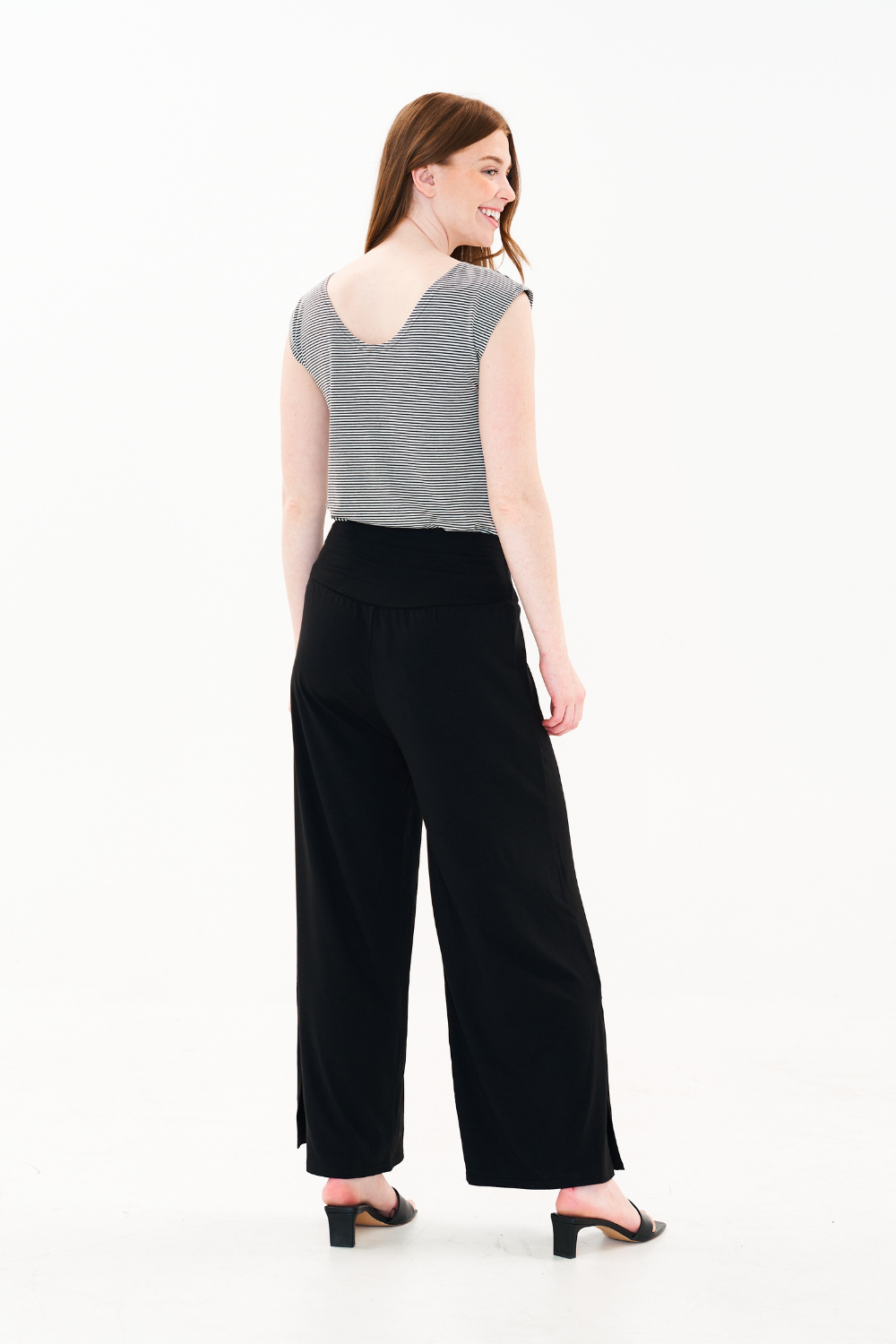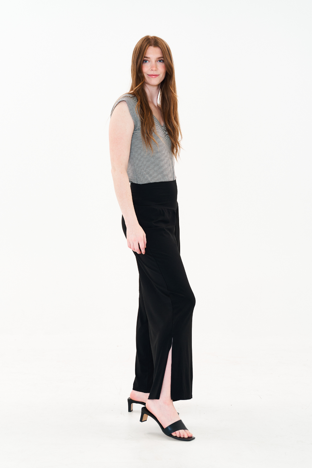 Palazzo style pant with a high, wide waistband and side slits at the hemline.