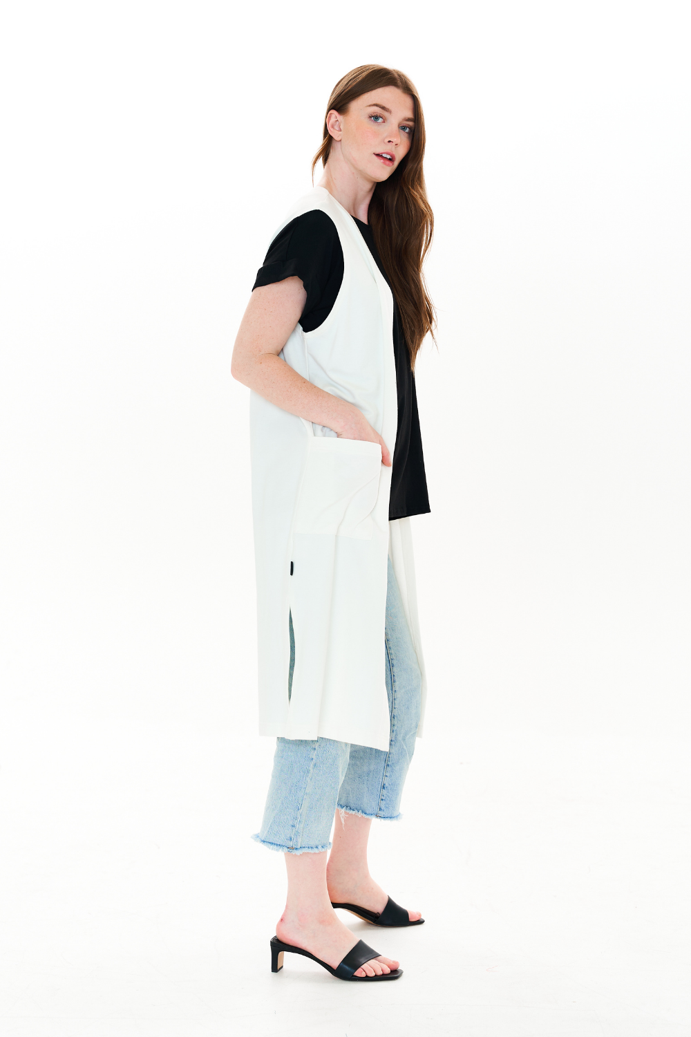 Sleek open-front sleeveless long vest with front square pockets and bottom side slits.