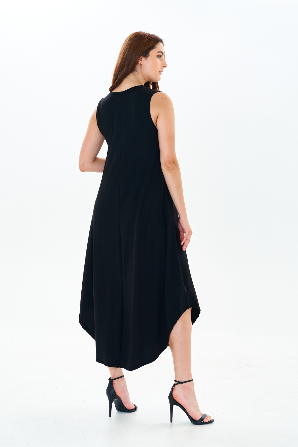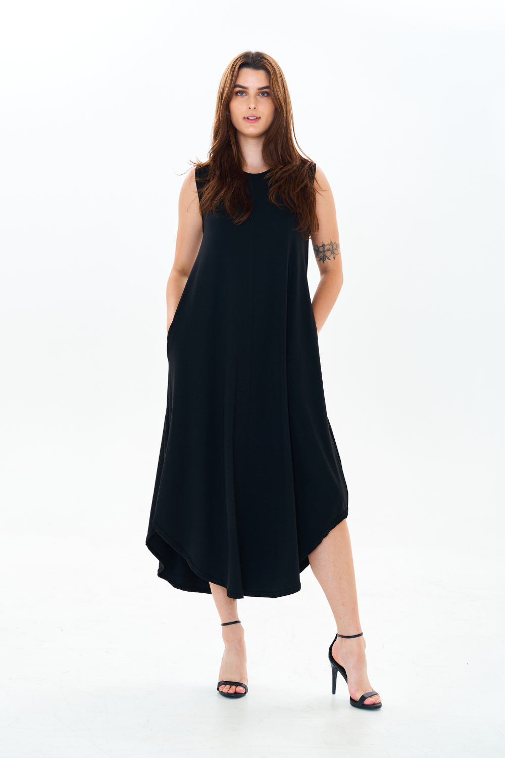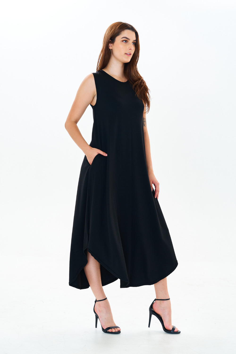A-line maxi dress with wide tank straps, side pockets and a rounded hemline.