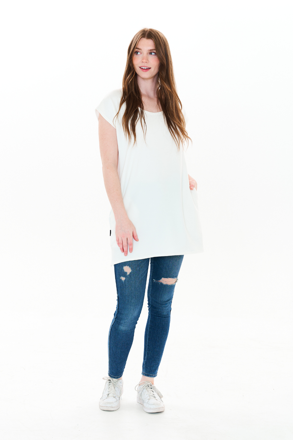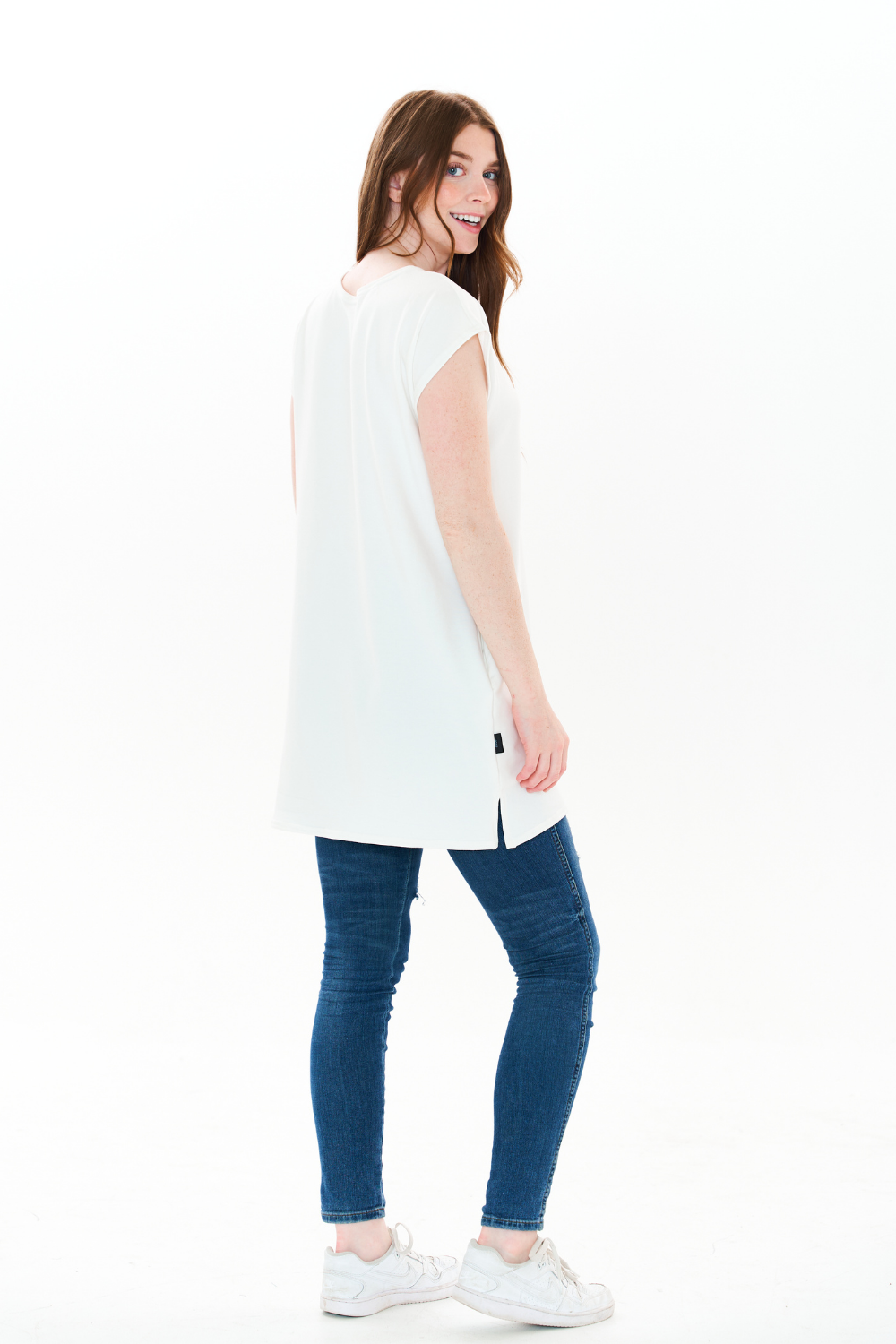 Relaxed boxy tunic with a reversible high-low neckline, printed pockets and side slits.