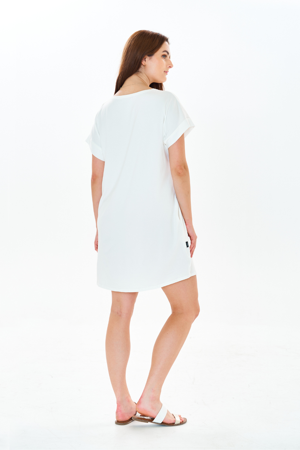 Relaxed-fit short dress with a round neckline, short cuffed sleeves, side pockets and mini side slits.