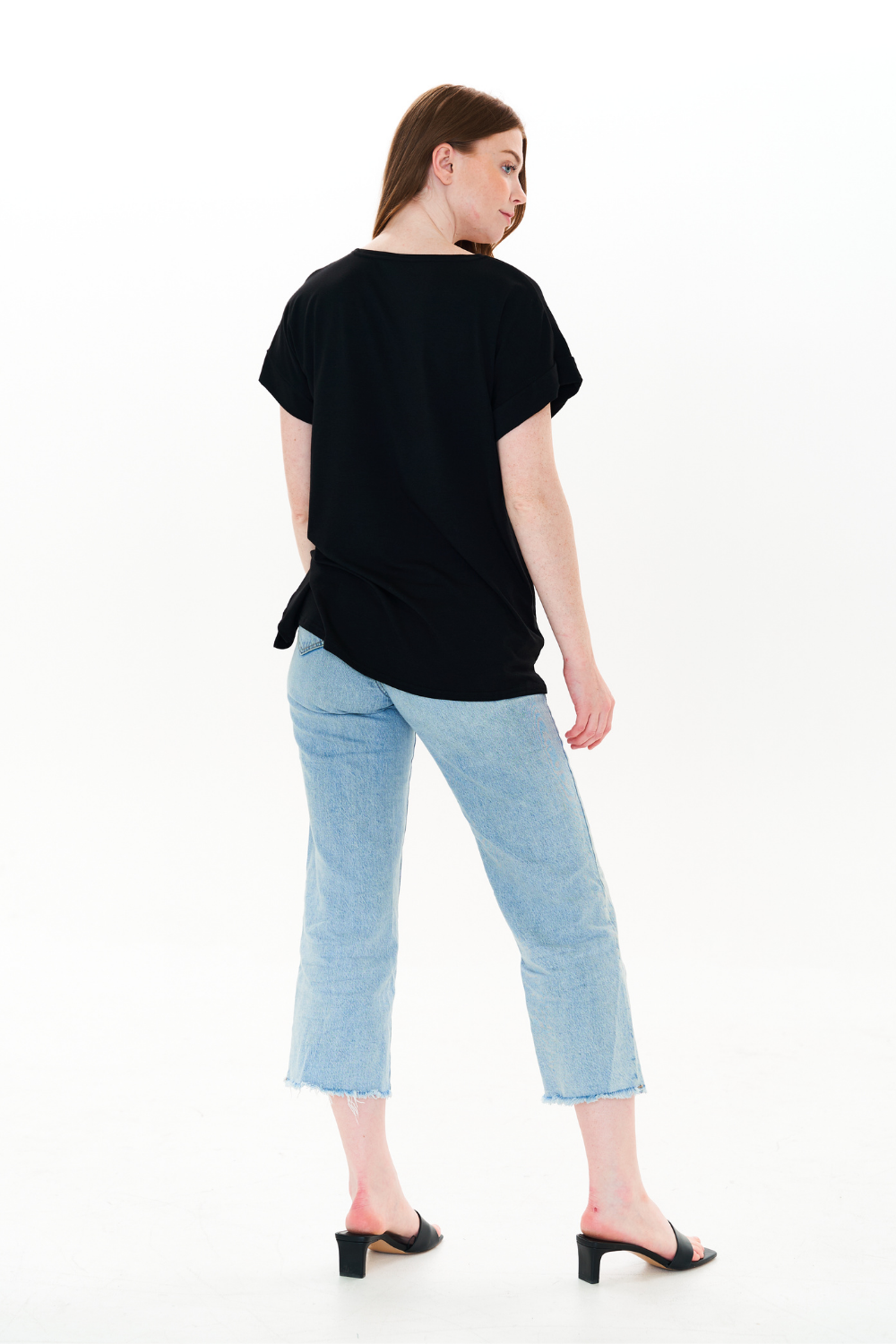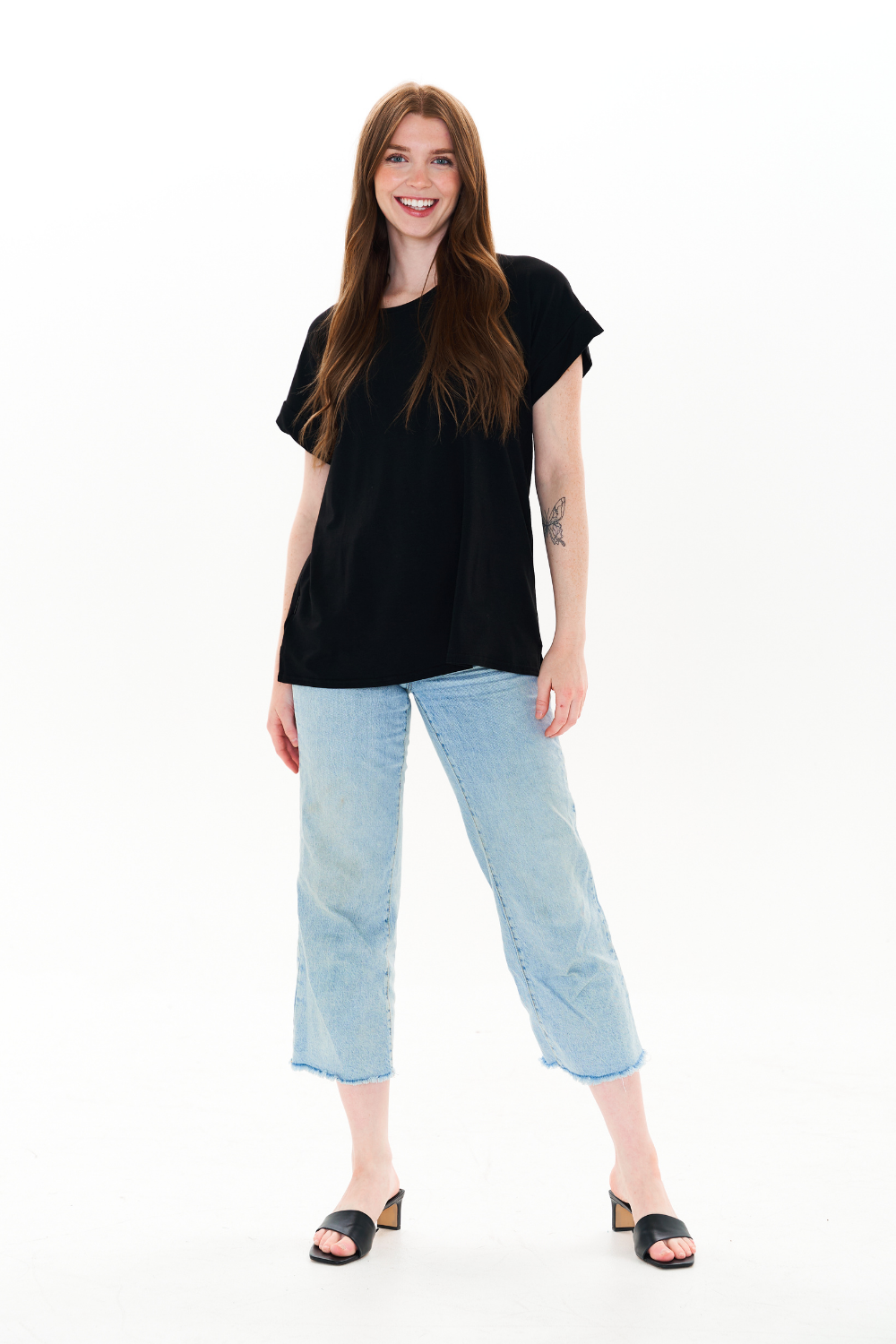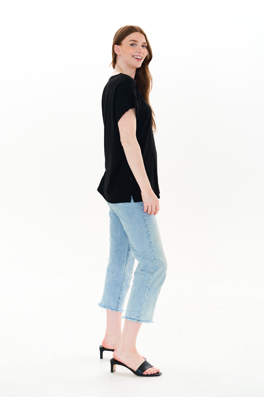 Relaxed-fit top with a round neckline, side slits and short cuffed sleeves.