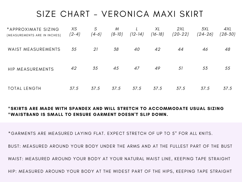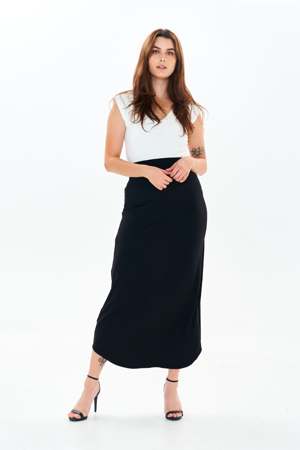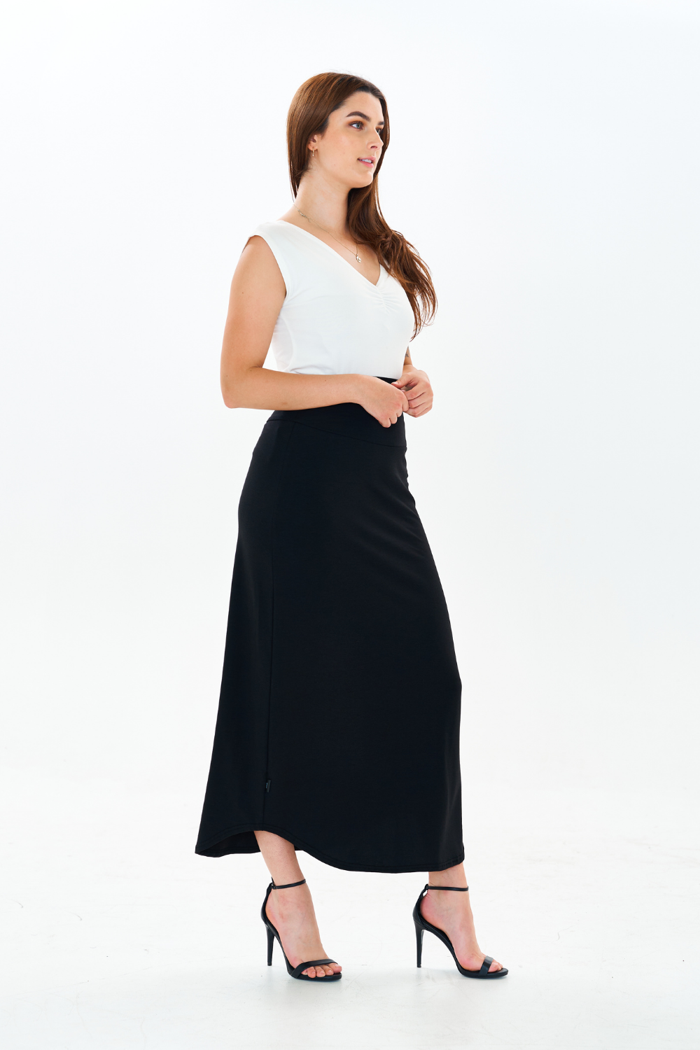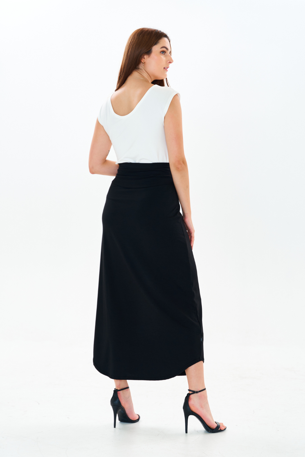 Maxi skirt with a high, wide waistband and a rounded hemline.