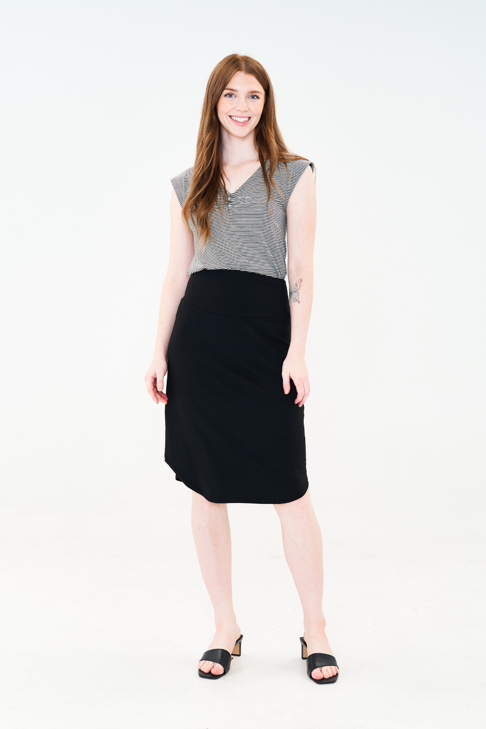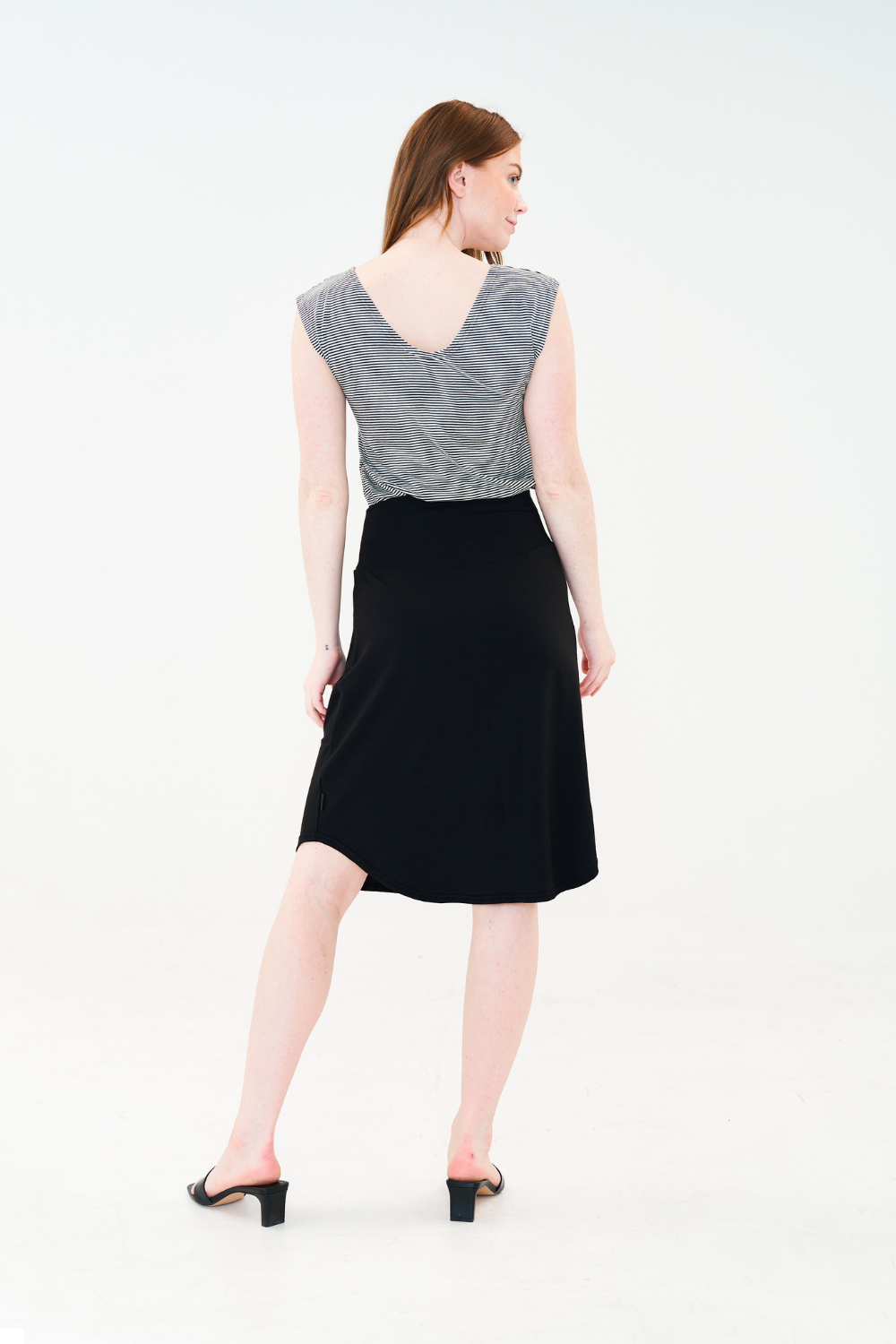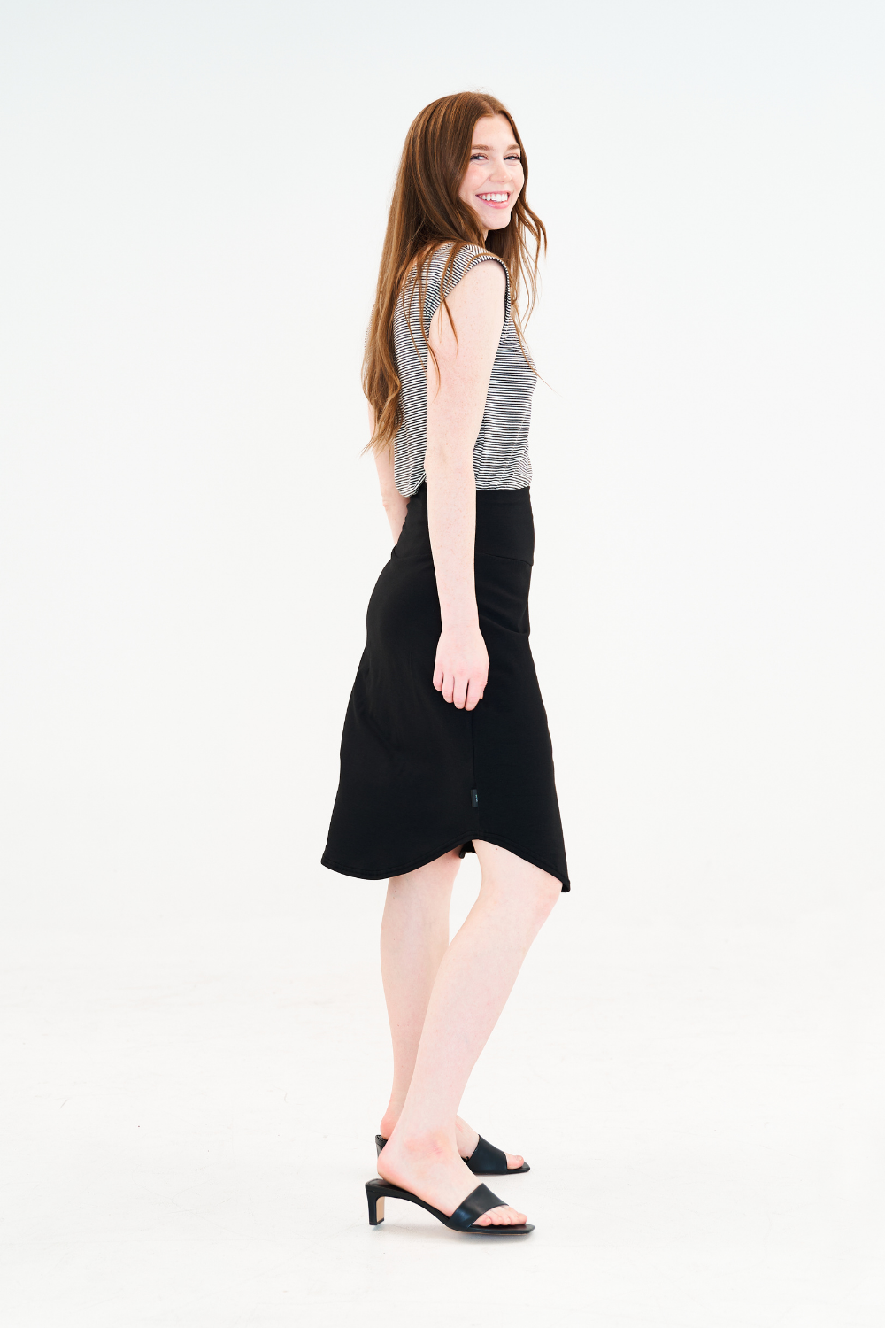 Mid-length skirt with a high, wide waistband and a rounded hemline.
